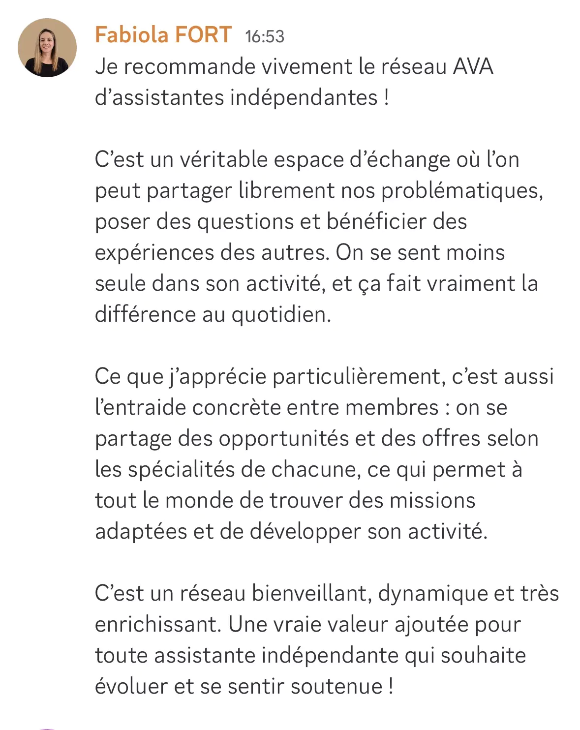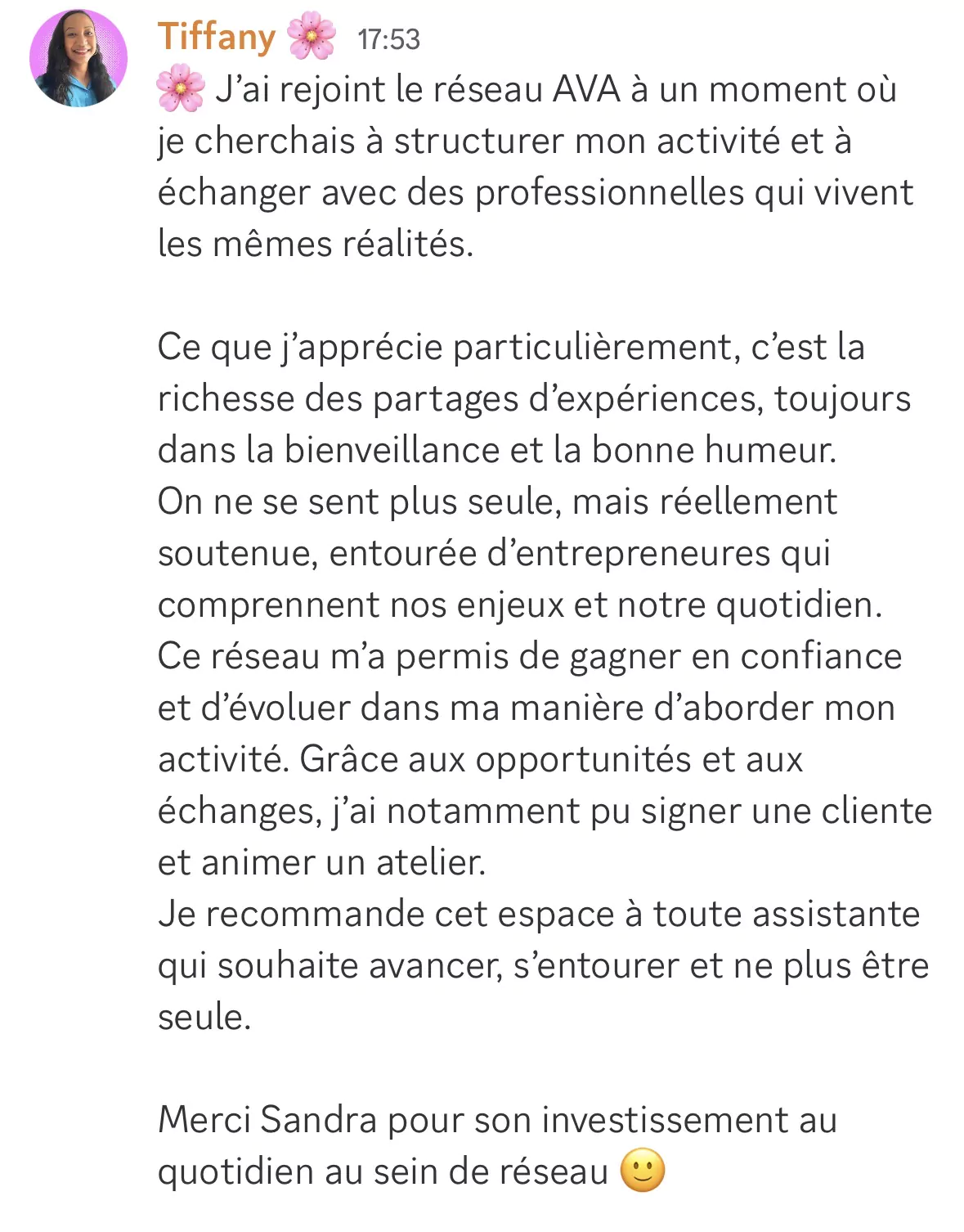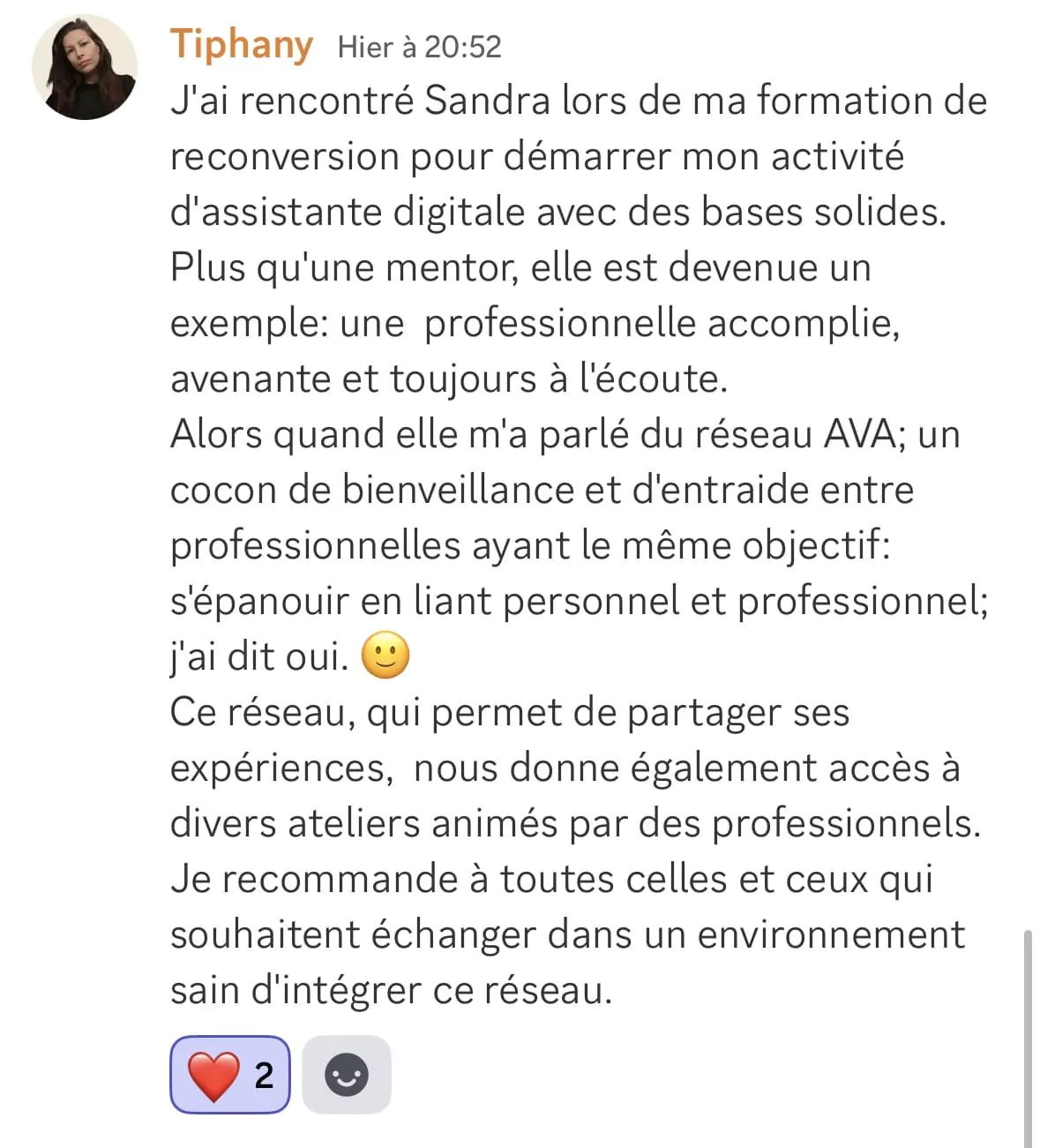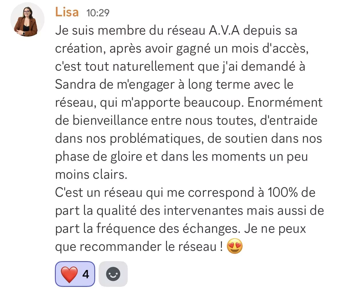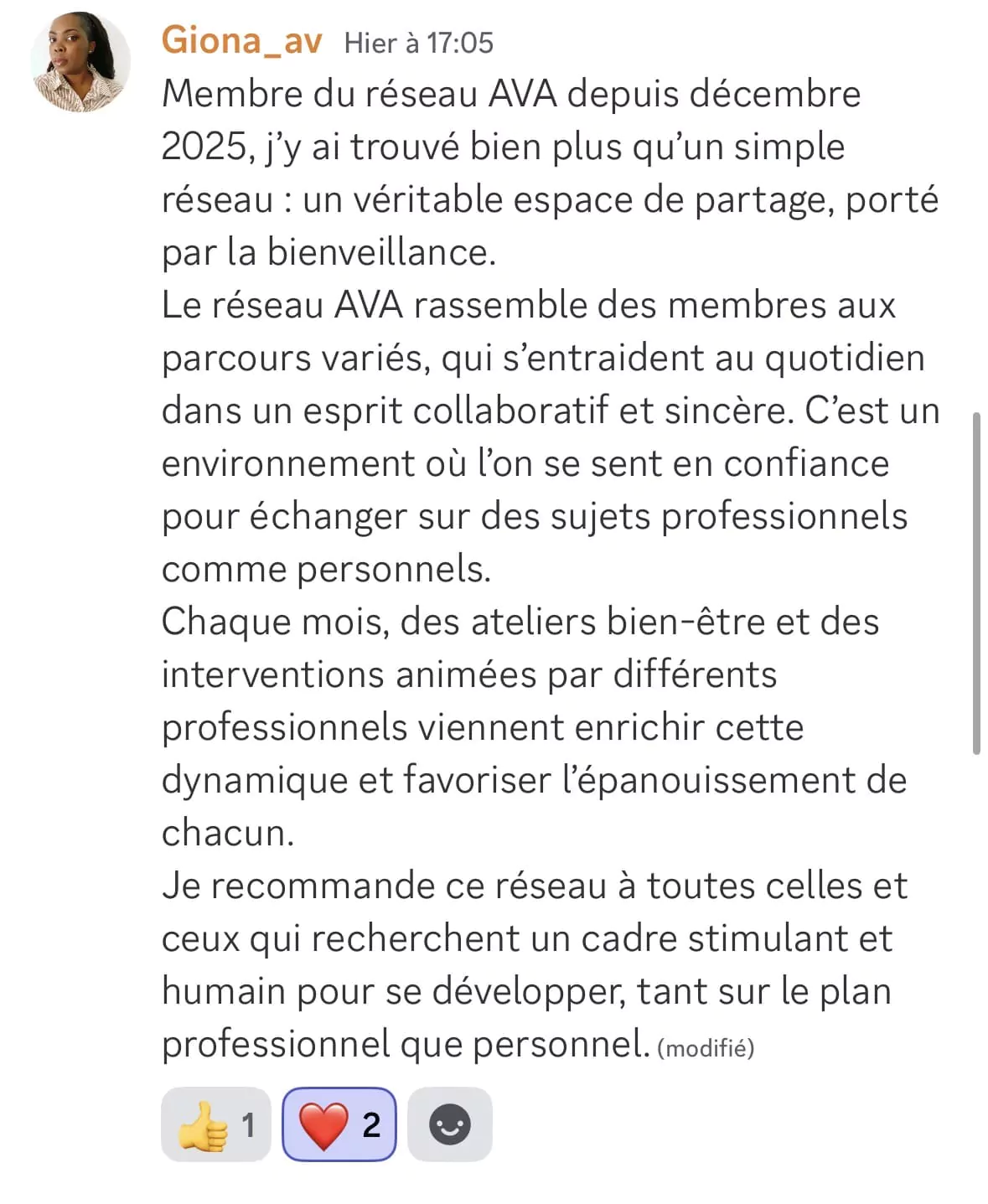Je suis profondément convaincue que la force d’une entrepreneuse réside dans son entourage. En créant le Réseau A.V.A, j’ai voulu offrir bien plus qu’une simple plateforme de mise en relation : j’ai bâti un écosystème où l’humain et l’expertise se rencontrent pour propulser chaque activité. Chaque jour, des échanges authentiques ont lieu au sein du club : je m’assure que nous abordions tous les sujets sans filtre, qu’il s’agisse de tes réussites professionnelles, de tes doutes plus personnels ou de ta santé mentale.